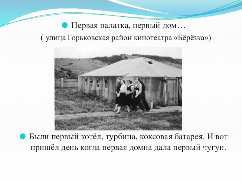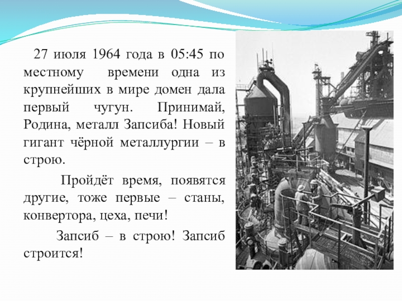 котёл, турбина, коксовая батарея. И вот пришёл день когда первая домна дала первый чугун.