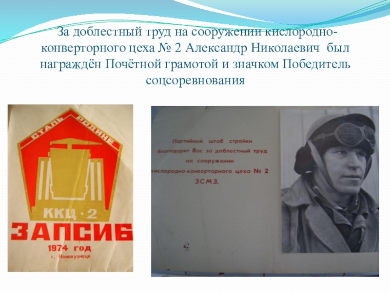 Слайд 10 За доблестный труд на сооружении кислородно-конверторного цеха № 2 Александр