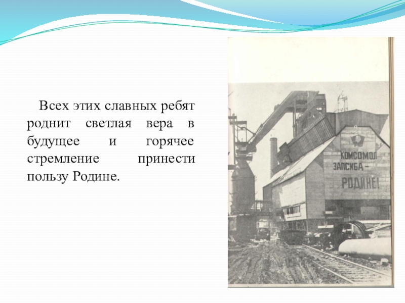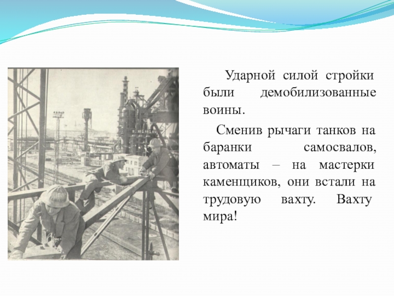 Слайд 4 Ударной силой стройки были демобилизованные воины.