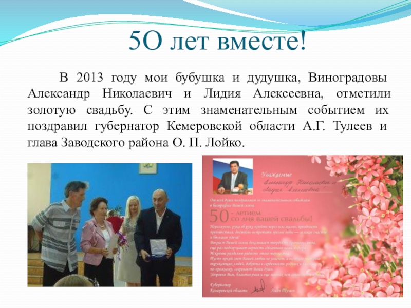 В 2013 году мои бубушка и дудушка, Виноградовы Александр Николаевич и Лидия Алексеевна, отметили золотую свадьбу. С этим знаменательным событием их поздравил губернатор Кемеровской области А.Г. Тулеев и глава Заводского района О. П. Лойко.