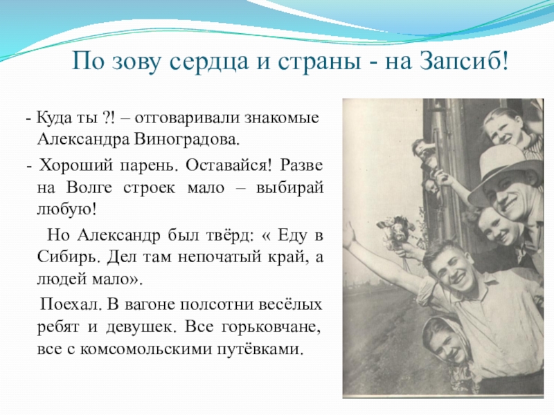 Поехал. В вагоне полсотни весёлых ребят и девушек. Все горьковчане, все с комсомольскими путёвками.