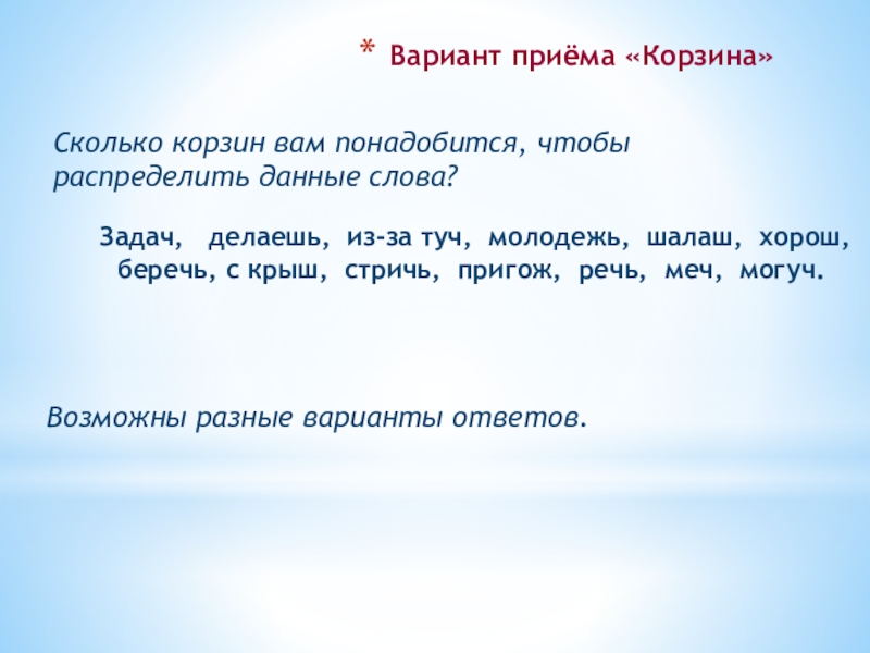 Задач, делаешь, из-за туч, молодежь, шалаш, хорош, беречь,