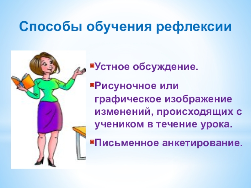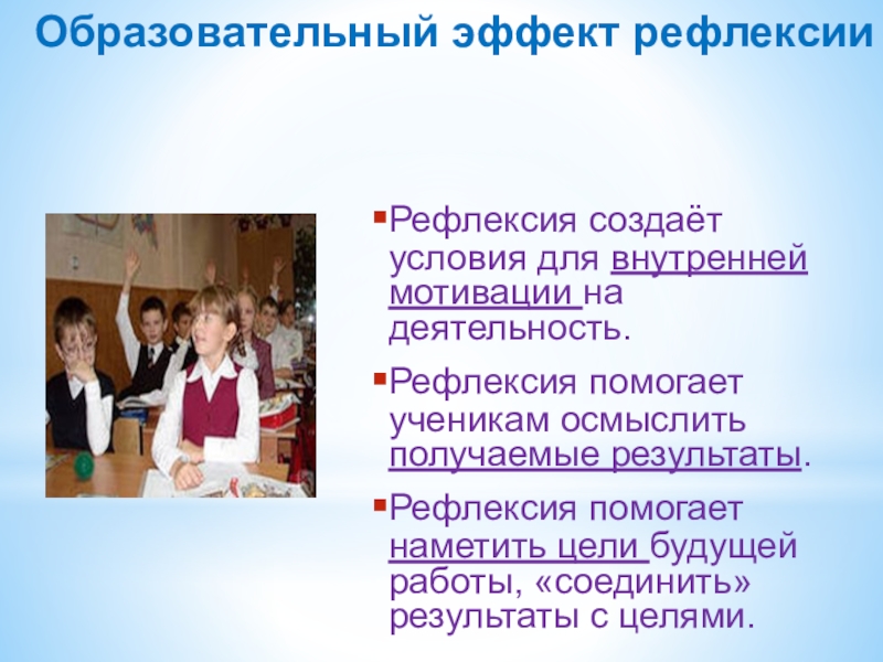 Слайд 38Рефлексия создаёт условия для внутренней мотивации на деятельность.