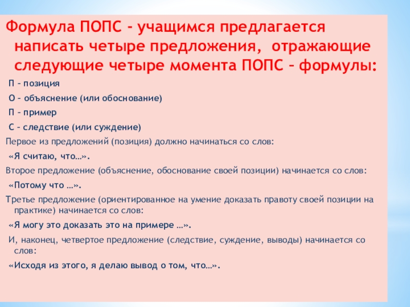 Формула ПОПС - учащимся предлагается написать четыре предложения, отражающие