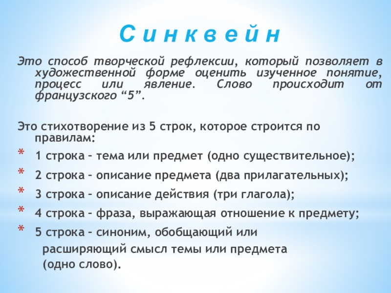 пояснении и зарекомендовали себя весьма эффективно. С одним "но"! Если учитель использует их постоянно, чтобы дети могли привыкнуть к такой работе. Иначе создание того же синквейна превратится в каторжную работу, а не позитивное и эффектное завершение темы.