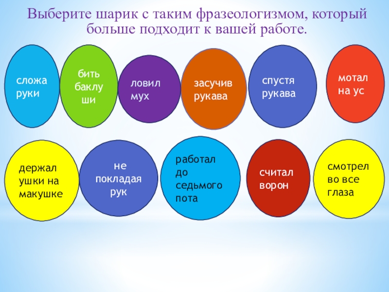 Слайд 13Выберите шарик с таким фразеологизмом, который больше подходит к вашей работе.