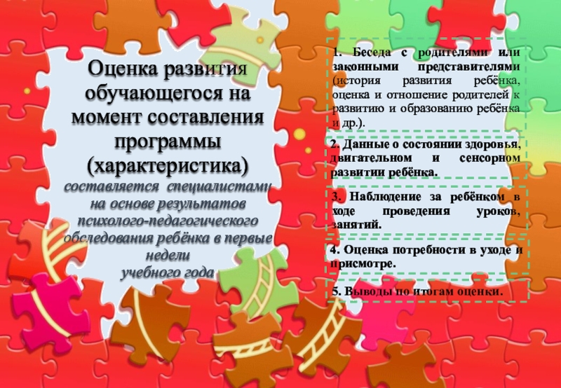 1. Беседа с родителями или законными представителями (история развития ребёнка, оценка и отношение родителей к развитию и образованию ребёнка и др.).