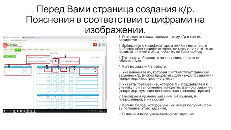 Слайд 4Перед Вами страница создания к/р. Пояснения в соответствии с цифрами на изображении.