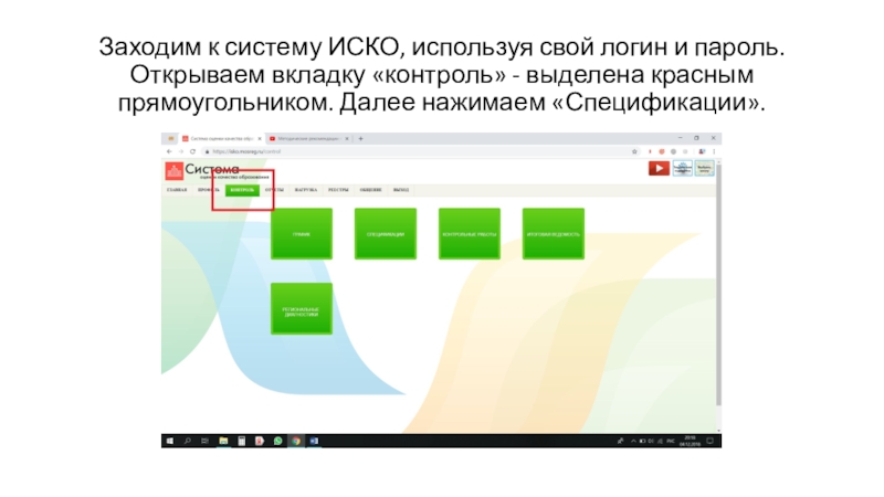 Заходим к систему ИСКО, используя свой логин и пароль. Открываем вкладку «контроль» - выделена красным прямоугольником. Далее нажимаем «Спецификации».