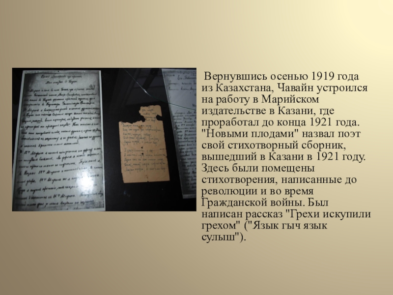 в Марийском издательстве в Казани, где проработал до конца 1921 года. "Новыми плодами" назвал поэт свой стихотворный сборник, вышедший в Казани в 1921 году. Здесь были помещены стихотворения, написанные до революции и во время Гражданской войны. Был написан рассказ "Грехи искупили грехом" ("Язык гыч язык сулыш").