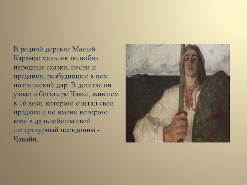 Слайд 7В родной деревне Малый Карамас мальчик полюбил народные сказки, песни и