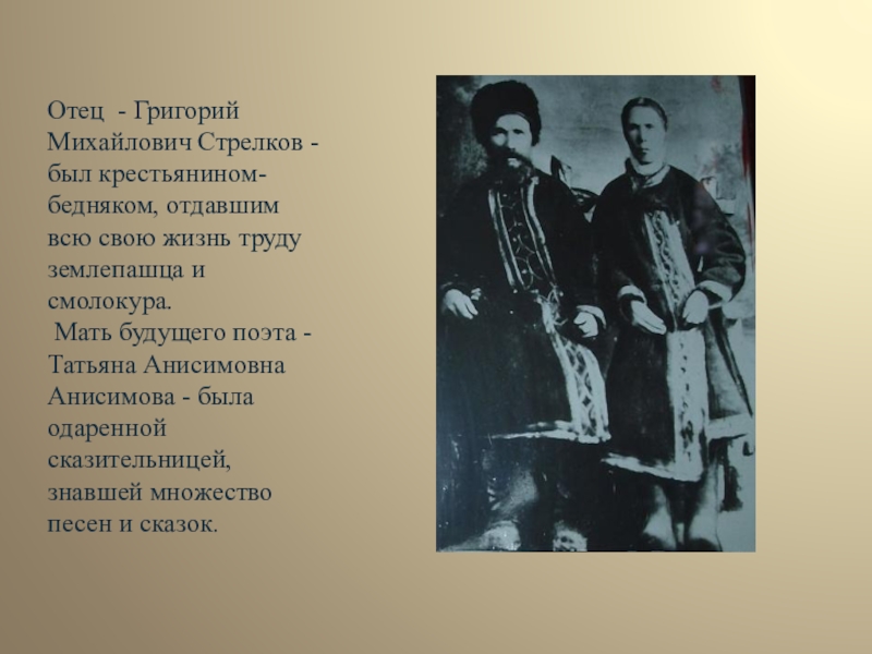 Мать будущего поэта - Татьяна Анисимовна Анисимова - была одаренной сказительницей, знавшей множество песен и сказок.