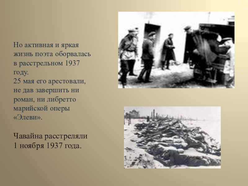 Слайд 23Но активная и яркая жизнь поэта оборвалась в расстрельном 1937 году.