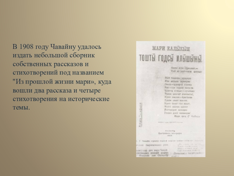 Слайд 13В 1908 году Чавайну удалось издать небольшой сборник собственных рассказов и