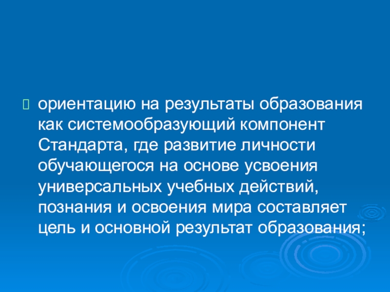 ориентацию на результаты образования как системообразующий компонент Стандарта, где развитие личности