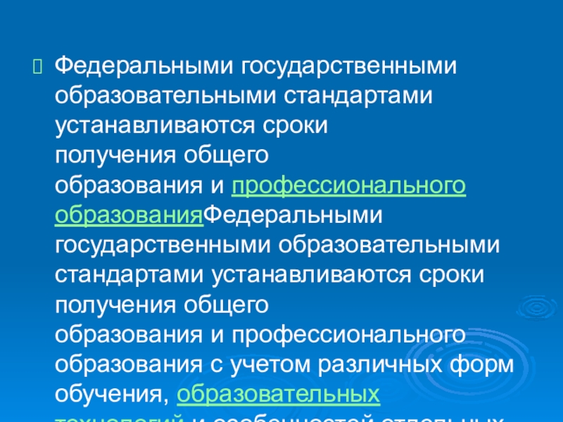 Федеральными государственными образовательными стандартами устанавливаются сроки получения общего образования и профессионального образованияФедеральными государственными образовательными