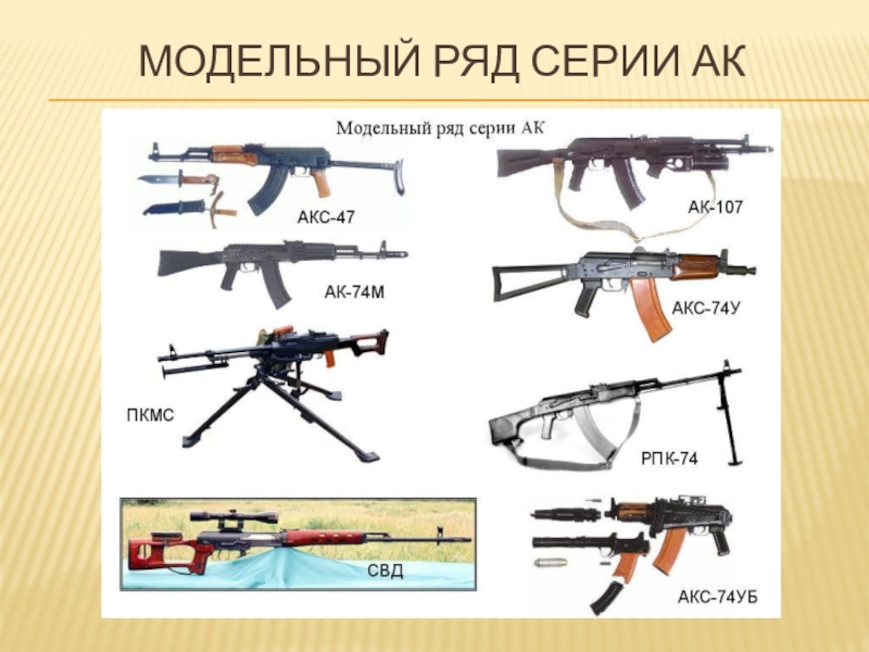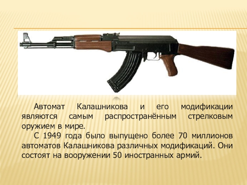 Слайд 5Автомат Калашникова и его модификации являются самым распространённым стрелковым оружием в