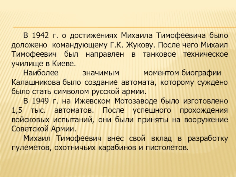 Слайд 4В 1942 г. о достижениях Михаила Тимофеевича было доложено командующему Г.К.