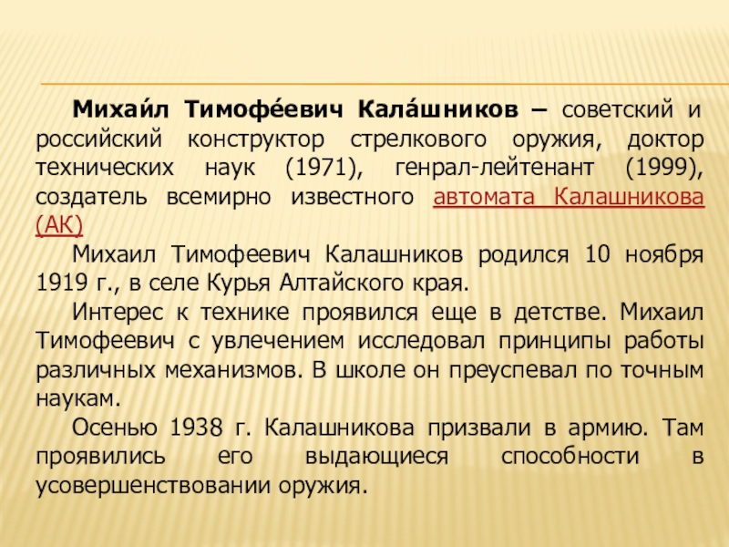 Презентация, доклад об инженерах 20 века - Михаил Тимофеевич Калашников