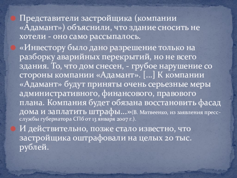 «Инвестору было дано разрешение только на разборку аварийных перекрытий, но не всего здания. То, что дом снесен, - грубое нарушение со стороны компании «Адамант». [...] К компании «Адамант» будут приняты очень серьезные меры административного, финансового, правового плана. Компания будет обязана восстановить фасад дома и заплатить штрафы...»(В. Матвеенко, из заявления пресс-службы губернатора СПб от 13 января 2007 г.).