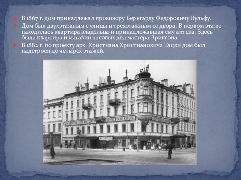 Слайд 6В 1867 г. дом принадлежал провизору Бернгарду Федоровичу Вульфу.