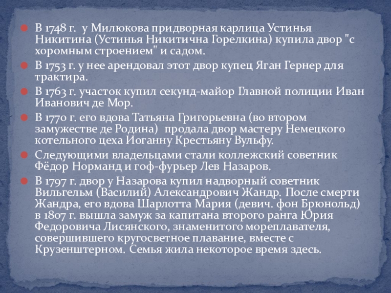 В 1734 г. двор Татищева купил комиссар Партикулярной верфи Яков Кириллович Милюков. В 1740 г. Милюков просит присоединить к своему владению и пустующий угловой участок. Арх. И. Шумахер построил здесь "образцовый" дом в пять окон с высокой кровлей.