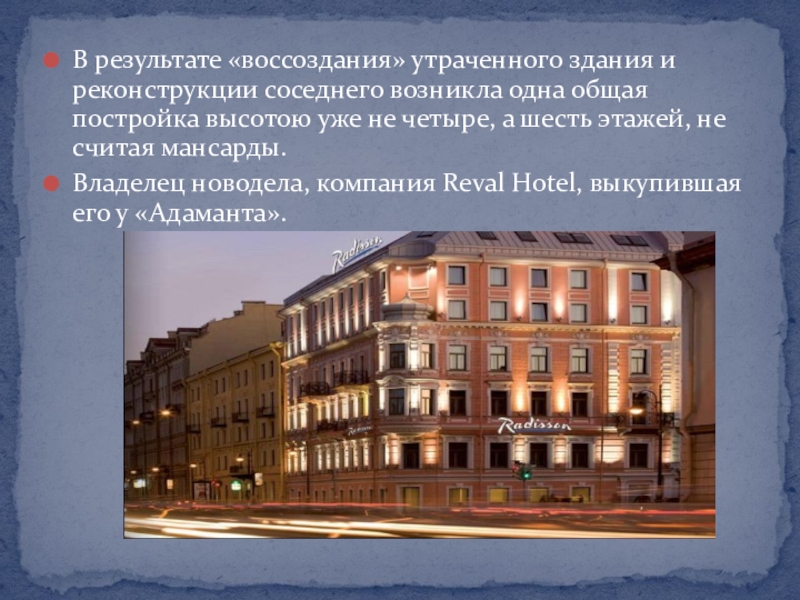 Владелец новодела, компания Reval Hotel, выкупившая его у «Адаманта».