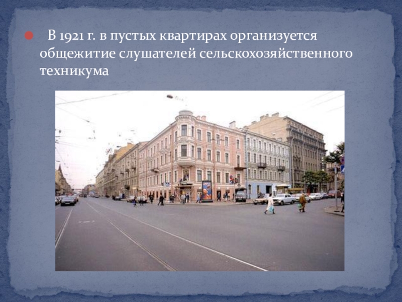 Слайд 8 В 1921 г. в пустых квартирах организуется общежитие слушателей сельскохозяйственного техникума
