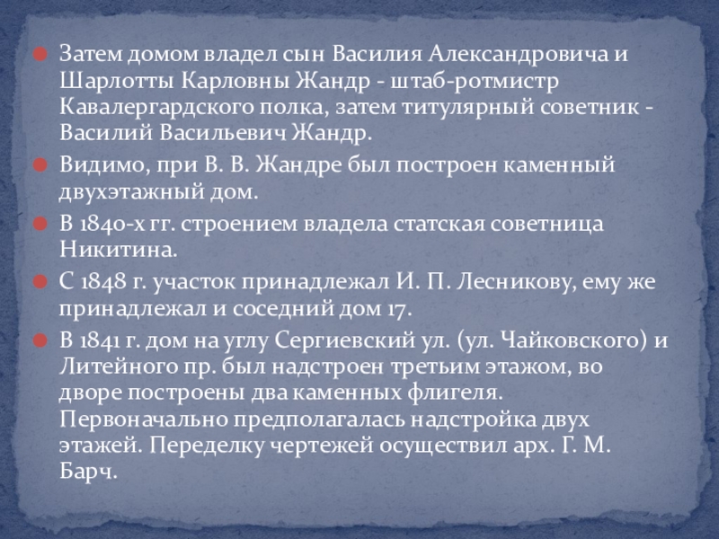 Слайд 5Затем домом владел сын Василия Александровича и Шарлотты Карловны Жандр -