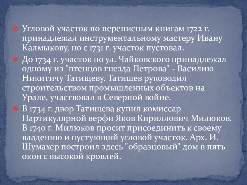 Слайд 3Угловой участок по переписным книгам 1722 г. принадлежал инструментальному мастеру Ивану