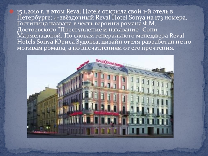 Петербурге: 4-звёздочный Reval Hotel Sonya на 173 номера. Гостиница названа в честь героини романа Ф.М. Достоевского "Преступление и наказание" Сони Мармеладовой. По словам генерального менеджера Reval Hotels Sonya Юриса Зудовса, дизайн отеля разработан не по мотивам романа, а по впечатлениям от его прочтения.
