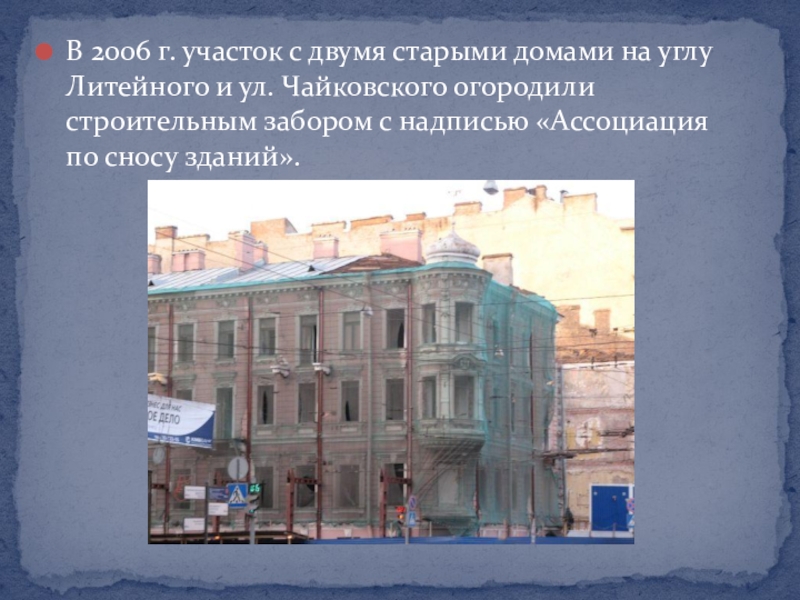 Слайд 9В 2006 г. участок с двумя старыми домами на углу Литейного