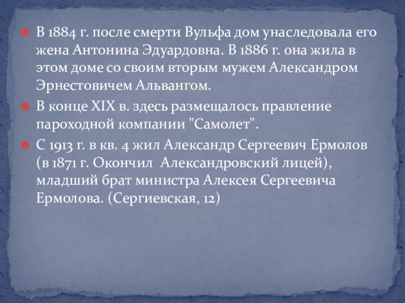 Слайд 7В 1884 г. после смерти Вульфа дом унаследовала его жена Антонина