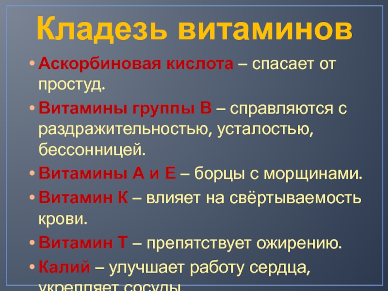 Кладезь витаминовАскорбиновая кислота – спасает от простуд.Витамины группы В – справляются с раздражительностью, усталостью, бессонницей.Витамины А и