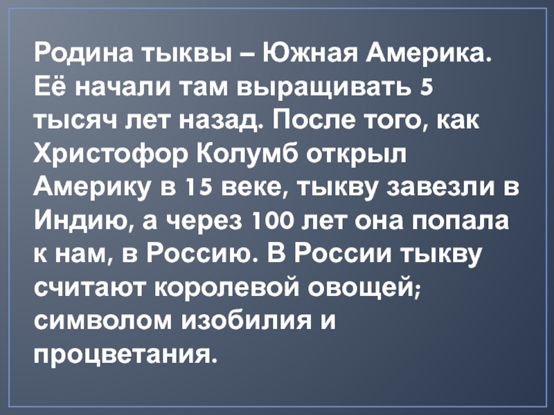 лет назад. После того, как Христофор Колумб открыл Америку в 15 веке, тыкву завезли в Индию, а через 100 лет она попала к нам, в Россию. В России тыкву считают королевой овощей; символом изобилия и процветания.