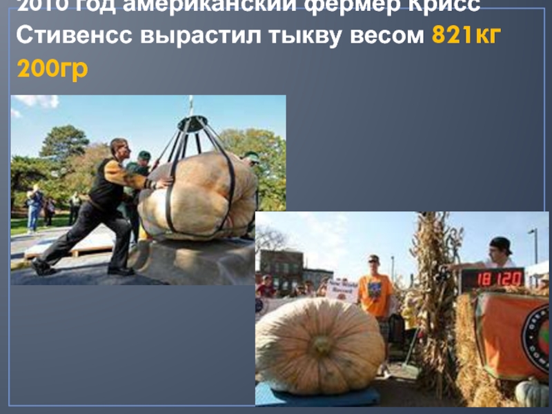 Слайд 62010 год американский фермер Крисс Стивенсс вырастил тыкву весом 821кг 200гр