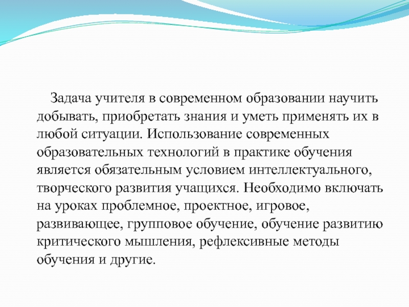 приобретать знания и уметь применять их в любой ситуации. Использование современных образовательных технологий в практике обучения является обязательным условием интеллектуального, творческого развития учащихся. Необходимо включать на уроках проблемное, проектное, игровое, развивающее, групповое обучение, обучение развитию критического мышления, рефлексивные методы обучения и другие.