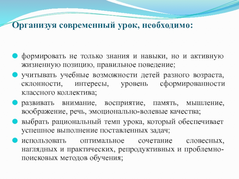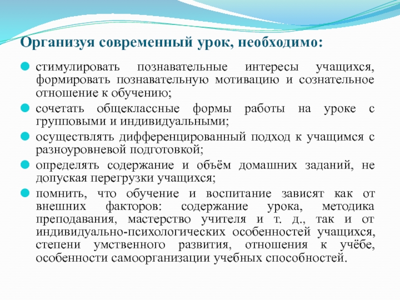 Слайд 23Организуя современный урок, необходимо: