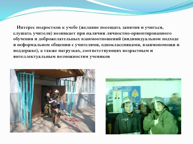 слушать учителя) возникает при наличии личностно-ориентированного обучения и доброжелательных взаимоотношений (индивидуальном подходе и неформальном общении с учителями, одноклассниками, взаимопомощи и поддержке), а также нагрузках, соответствующих возрастным и интеллектуальным возможностям учеников
