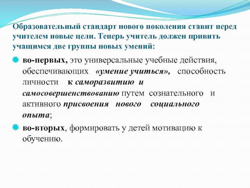 Слайд 5Образовательный стандарт нового поколения ставит перед учителем новые цели. Теперь учитель