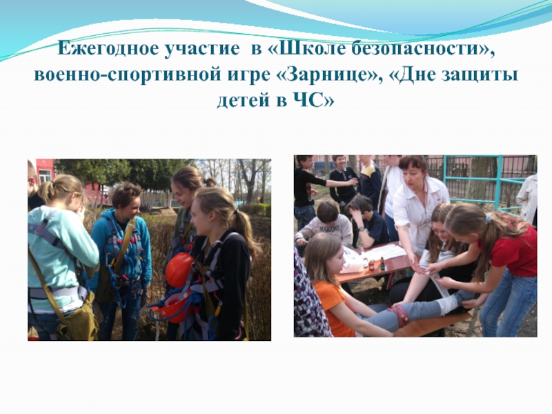 Слайд 18Ежегодное участие в «Школе безопасности», военно-спортивной игре «Зарнице», «Дне защиты детей