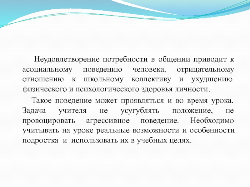 Слайд 12 Неудовлетворение потребности в общении приводит к асоциальному поведению