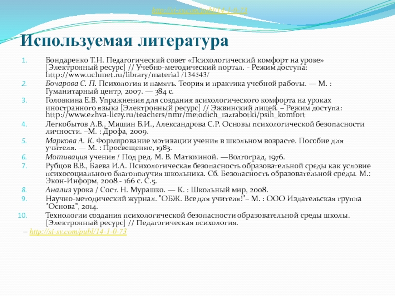 Головкина Е.В. Упражнения для создания психологического комфорта на уроках иностранного языка [Электронный ресурс] // Эжвинский лицей. – Режим доступа: http://www.ezhva-licey.ru/teachers/nmr/metodich_razrabotki/psih_komfort