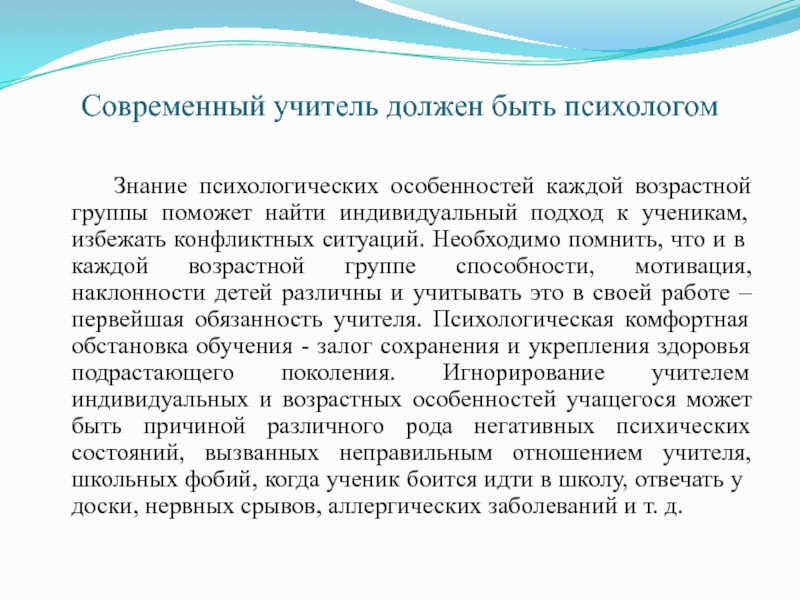 возрастной группы поможет найти индивидуальный подход к ученикам, избежать конфликтных ситуаций. Необходимо помнить, что и в каждой возрастной группе способности, мотивация, наклонности детей различны и учитывать это в своей работе – первейшая обязанность учителя. Психологическая комфортная обстановка обучения - залог сохранения и укрепления здоровья подрастающего поколения. Игнорирование учителем индивидуальных и возрастных особенностей учащегося может быть причиной различного рода негативных психических состояний, вызванных неправильным отношением учителя, школьных фобий, когда ученик боится идти в школу, отвечать у доски, нервных срывов, аллергических заболеваний и т. д.