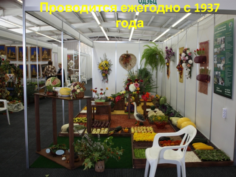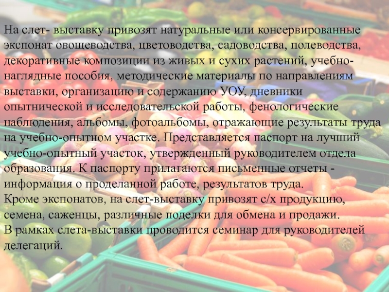 Слайд 8На слет- выставку привозят натуральные или консервированные экспонат овощеводства, цветоводства, садоводства,
