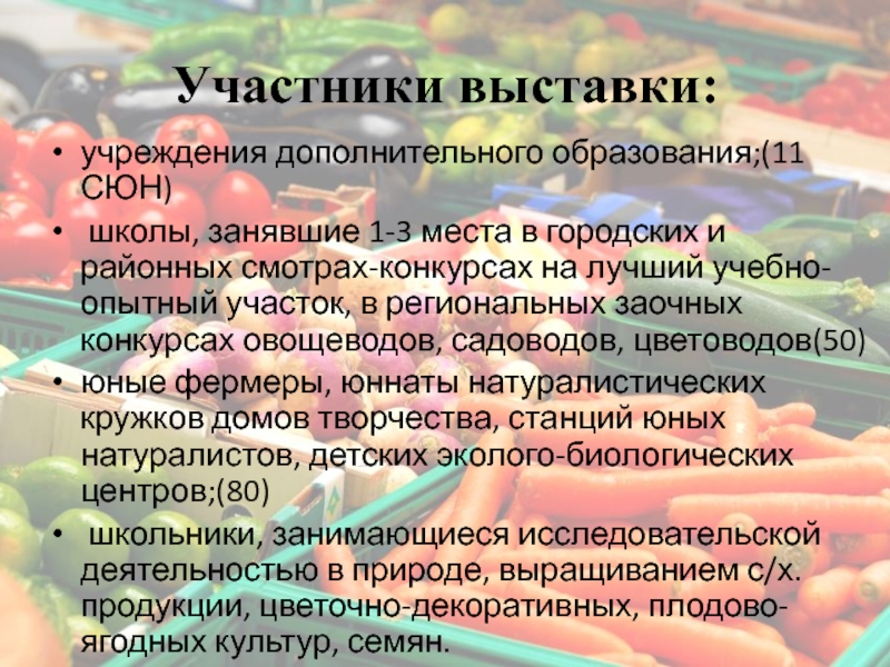 Участники выставки:учреждения дополнительного образования;(11 СЮН) школы, занявшие 1-3 места в городских и районных смотрах-конкурсах на лучший учебно-опытный