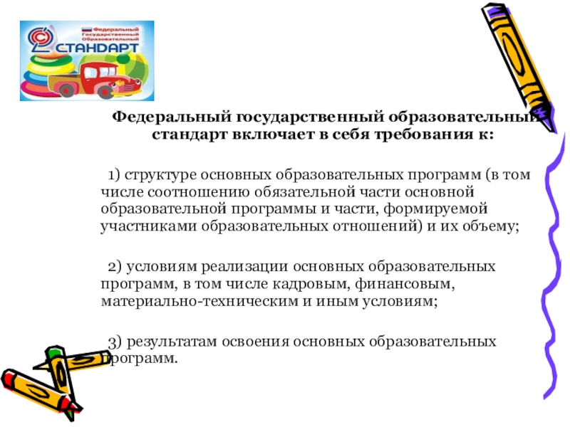 Слайд 3 Федеральный государственный образовательный стандарт включает в себя требования к: