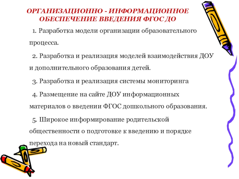 Слайд 10ОРГАНИЗАЦИОННО - ИНФОРМАЦИОННОЕ ОБЕСПЕЧЕНИЕ ВВЕДЕНИЯ ФГОС ДО