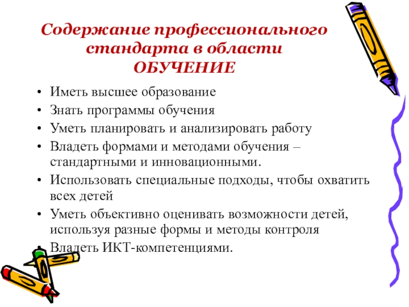 Слайд 18Содержание профессионального стандарта в области ОБУЧЕНИЕ