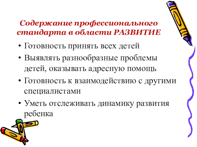 Слайд 20Содержание профессионального стандарта в области РАЗВИТИЕ